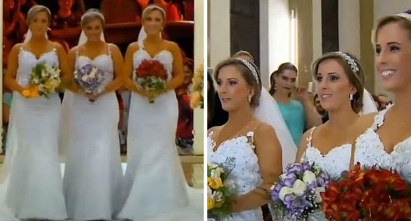 Identical triplet sisters exchange vows with their respective partners in a stunning triple church wedding ceremony