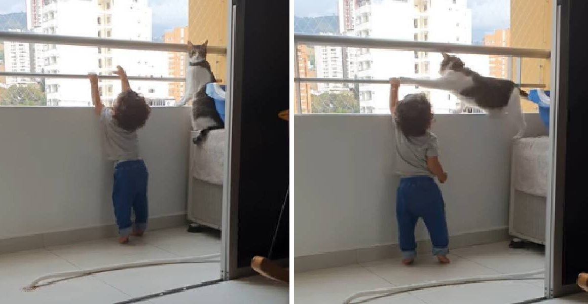 A one-year-old was walking down the balcony in the video and a cat was watching his steps all the time. When the child touched the fence with his hands, the cat immediately administered a safety dose.
