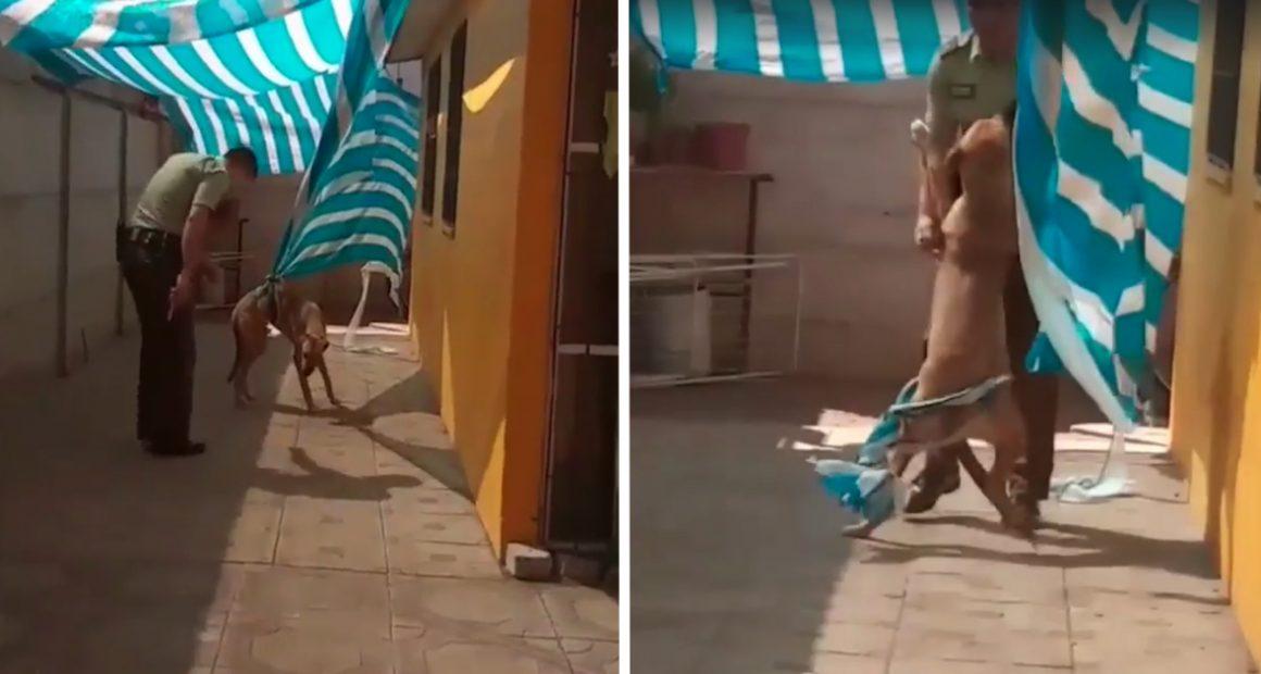 Chilean Carabinieri Police Officer Giovanni Domchi received a call about a dog tangled in a sheet. Neighbors heard the dog screaming for help and told police that the owners were not there at the time.
