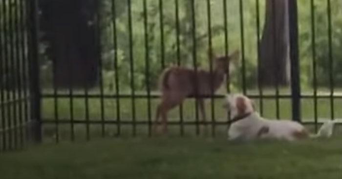 When the dog Charlie found a deer stuck between a hole in the iron fence, he wanted to help as much as he could. But since there was little he could do, the deer waited – he kept the animals until the deer was rescued by dog owner Alice Nonley.