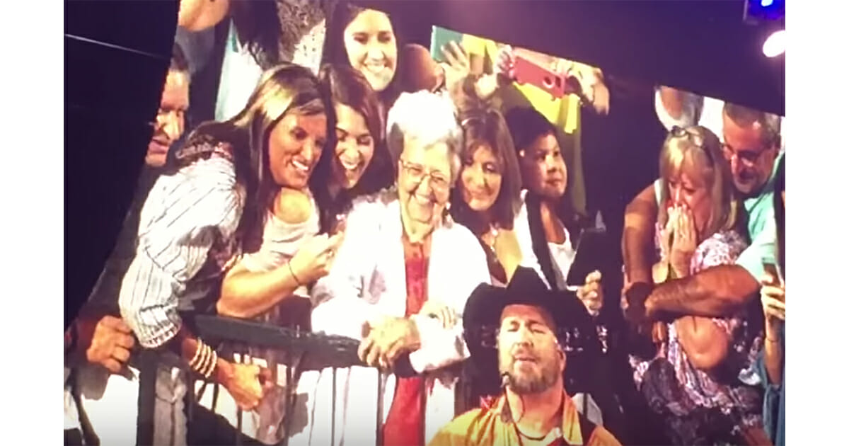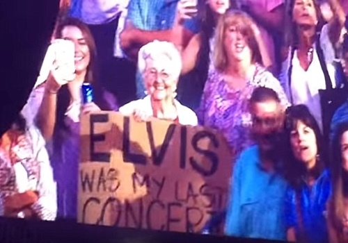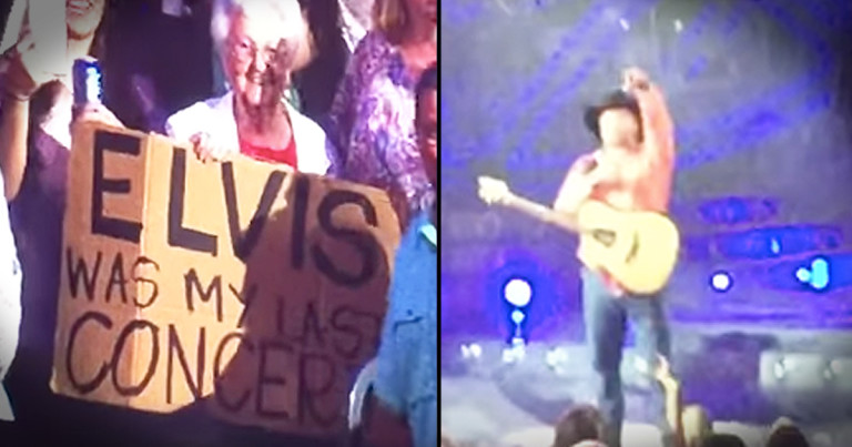 “ELVIS WAS MY LAST CONCERT,” read the sign, and it turned out the woman holding it, Barbara, was special indeed. She was recently widowed, and had gone to Garth’s concert along with her daughter and granddaughter. Why? To celebrate turning 89.
