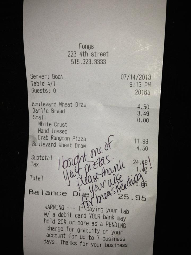 “I have breastfed three children…I have breastfed them in a countless number of places both pleasant and unpleasant, discreetly and out in the open. I have gotten many looks and stares, but tonight erases any negativity I have ever received. I ate at Fongs for the first time tonight. Having a fussy baby I nursed him for awhile in the booth and eventually left the table early as to not disrupt the restaurant. The waitress gave this receipt to my husband. I was speechless and emotional. Although I don’t need a pat on the back for feeding my child, it sure felt amazing. It is amazing how we women can make each other feel when we empower each other.”
