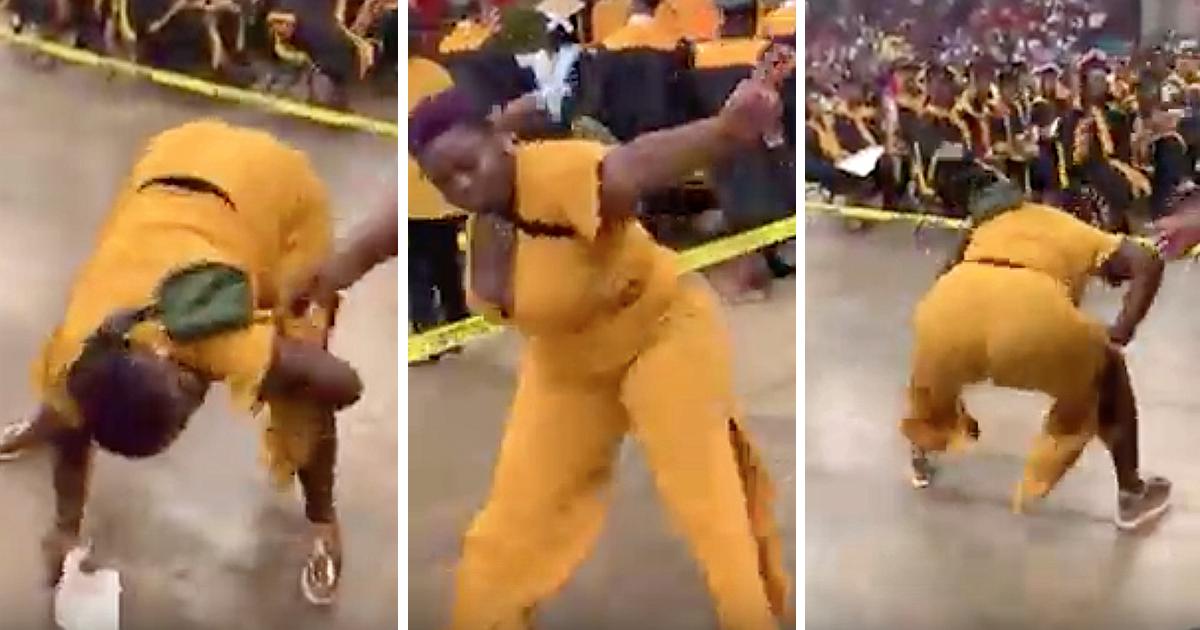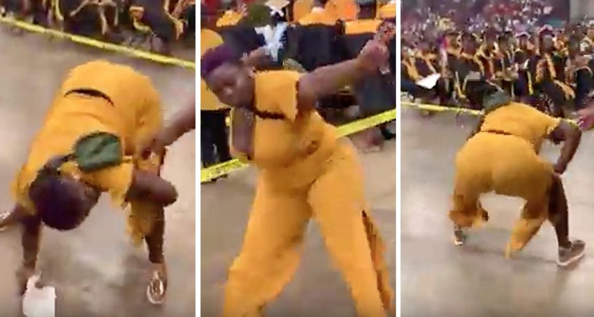 Dressed in a bold yellow jumpsuit, the woman continues her dance moves until security escorts her out. Graduating students watched in amazement as this mother sparkled during their ceremony. The moment was further highlighted with the woman’s slicked-back purple hair drawing attention to her dancing.